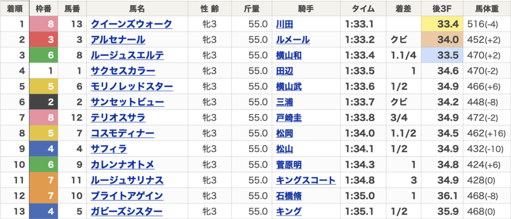 クイーンズウォークは抑えてからの直線外から伸びて1着、内で粘って伸びてきたアルセナールが2着、スタートで出遅れ最後尾から2番目の位置での競馬から直線で最外から差してルージュスエルテが3着。