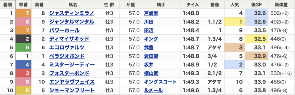 ジャスティンミラノが直線で早めに仕掛け、その後にジャンタルマンタルが仕掛けそれぞれ前に残っていたパワーホールを抜き去り1着、2着に入着。とはいえ、ジャスティンミラノはジャンタルマンタルに快勝し、これからのクラシック戦線でも戦える力を示してくれました。パワーホールはそのまま3着に残した。スローで流れて前で脚が残っている強い馬が来たという印象です。エコロヴァルツはゲート出た瞬間から様子がおかしく前での競馬、道中も落ち着かず直線でのジャスティンミラノなどの仕掛けに付いていけず、ミスタージーティーはこのスローな展開、この相手では武器である末脚は生かせなかった状況でした。