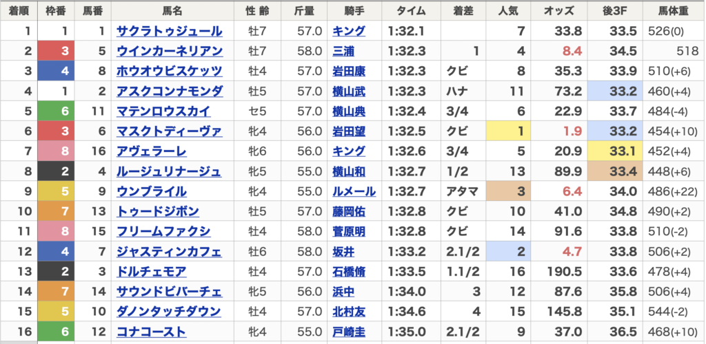 サクラトュジュールはいつもより中団前目の競馬で最後はしっかり伸びて勝ち切りました。ウインカーネリアンは逃げのまま押し切って2着、ホウオウビスケッツは前での競馬で粘って3着とまだ前優位の馬場は変わってないのかと思います。マスクトディーヴァは出遅れましたが、道中脚を溜めていれば来たんじゃないのかと思うくらいしっかり末脚使えてましたし強さは見せてくれました。